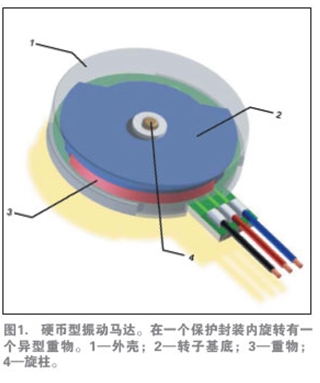 多數(shù)振動(dòng)馬達(dá)由一個(gè)較小的電動(dòng)馬達(dá)驅(qū)動(dòng)一個(gè)偏心配重,如圖1所示。馬達(dá)分為直流有刷或無刷電機(jī),有兩種基本的結(jié)構(gòu):硬幣狀(扁平)與圓柱形(條狀)。