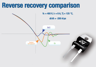 像STPSC806D和STPS1006D 這類碳化硅二極管給開關(guān)式電源(SMPS)設(shè)計人員帶來的另一個好處是,可以提高開關(guān)頻率,使其它元器件如濾波電容和電感變得更小,成本更低廉,功耗更低。