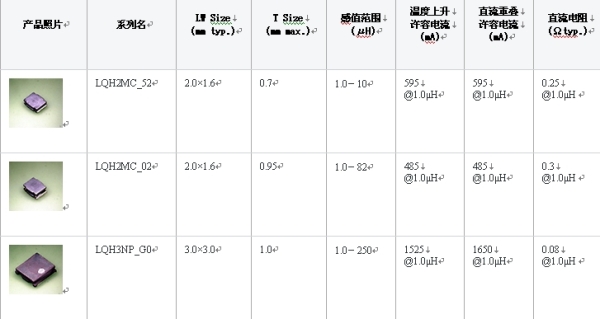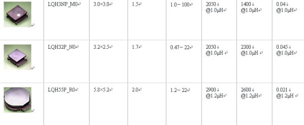 表1中展示了繞線型功率電感LQH系列的產品線。LQH系列是擁有各種不同尺寸的繞線行電感,LQH2MC_52系列為最小尺寸,用于手機等小型液晶模塊;AQH55P_R0系列為最大尺寸,用于筆記本電腦硬盤和數(shù)碼相機。