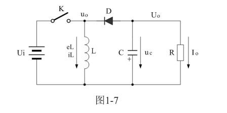 圖1-7中,Ui為輸入電源,K為控制開關,L為儲能電感,D為整流二極管,C為儲能濾波電容,R為負載電阻。當控制開關K接通的時候,輸入電源Ui開始對儲能電感L加電,流過儲能電感L的電流開始增加,同時電流在儲能電感中也要產(chǎn)生磁場;當控制開關K由接通轉為關斷的時候,儲能電感會產(chǎn)生反電動勢,使電流繼續(xù)流動,并通過整流二極管D進行整流,再經(jīng)電容儲能濾波,然后向負載R提供電流輸出??刂崎_關K不斷地反復接通和關斷過程,在負載R上就可以得到一個負極性的電壓輸出。