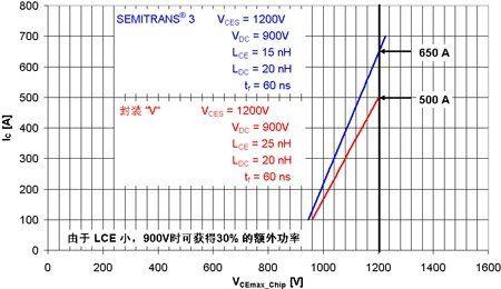 當(dāng)使用低電感模塊時(shí),可以實(shí)現(xiàn)高可靠性和最高效率。圖3顯示SEMITRANS®3和與其作對比的不同形狀封裝“C”之間的差異。由于模塊的電感小,SEMITRANS®3在芯片的最大反向電壓達(dá)到之前可切換的電流值要高30%。受益于主端子加上用于DCB的對稱并聯(lián)設(shè)計(jì),SEMITRANS®模塊可實(shí)現(xiàn)低電感(請注意,依托模塊電感,半導(dǎo)體芯片上實(shí)際產(chǎn)生的電壓永遠(yuǎn)高于端子上產(chǎn)生電壓)。