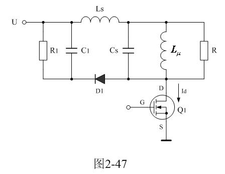 在圖2-46中,Cs1、Cs2都是分布電容,它們對于漏感 來說,既可以產(chǎn)生串聯(lián)振蕩,又可以產(chǎn)生并聯(lián)振蕩。在電源開關(guān)管Q1導(dǎo)通瞬間,漏感與分布電容主要是產(chǎn)生串聯(lián)振蕩,因為輸入電壓開始向串聯(lián)振蕩回路提供能量;在電源開關(guān)管Q1關(guān)斷瞬間,漏感與分布電容主要是產(chǎn)生并聯(lián)振蕩,因為漏感 必須要通過并聯(lián)回路釋放能量。在實際應(yīng)用中,漏感相對于勵磁電感 來說很小,因此如果不考慮漏感的作用,完全可以把Cs1、Cs2看成是一個分布電容。