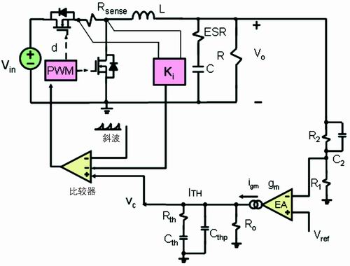 當(dāng)輸入和輸出電壓變化時,若高端MOSFET導(dǎo)通的時間固定不變,那么系統(tǒng)將工作在變頻模式,不利于電感的優(yōu)化工作。因此在PWM內(nèi)部需要一個前饋電路,使高端MOSFET的導(dǎo)通時間可隨輸入電壓成反比變化,及隨輸出電壓成正比變化,從而在輸入電壓和負(fù)載變化時,維持轉(zhuǎn)換器近似工作于定頻方式。