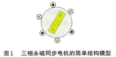 三相混合式步進(jìn)電機(jī)的工作原理十分類似于永磁同步伺服電機(jī)。其轉(zhuǎn)子上所用永磁磁鐵同樣是具有高磁密特性的稀土永磁材料,所以在轉(zhuǎn)子上產(chǎn)生的感應(yīng)電流對(duì)轉(zhuǎn)子磁場(chǎng)的影響可忽略不計(jì)。在結(jié)構(gòu)上,它相當(dāng)于一種多極對(duì)數(shù)的交流永磁同步電機(jī)。由于輸入是三相正弦電流,因此產(chǎn)生的空間磁場(chǎng)呈圓形分布,而且可以用永磁式同步電機(jī)的結(jié)構(gòu)模型(見圖1)分析三相混合式步進(jìn)電機(jī)的轉(zhuǎn)矩特性。為便于分析,可做如下假設(shè):