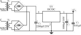 三相電度表有三相三線,三相四線,輸入電壓有3×(220~240)V/380~400V、3×57V/100V等。三相電度表供電電路可以參考單相電度表電源的設(shè)計(jì)方法,對于三相四線供電電路,可以在每一相線對零線之間接1只線性變壓器,共3只線性變壓器;對三相三線可以取一相如Β相作為公共地線,A、C相對Β相接2只線性變壓器。這些變壓的副邊單獨(dú)整流后再將輸出的正極接在一起、負(fù)極接在一起,經(jīng)電容濾波后,再通過DC/DC變換器輸出穩(wěn)定電壓,向電度表供電,如圖5所示。