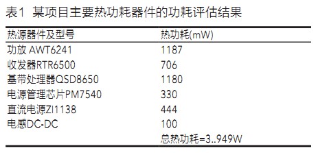 終端平臺的熱源器件主要有基帶芯片、射頻芯片、功放、電源管理芯片等,這些器件的功耗有的可以從廠商給的datasheet中查到,有的查不到,對于從datasheet中查不到功耗數(shù)據(jù)的熱源器件,需要根據(jù)經(jīng)驗或同類項目的測試數(shù)據(jù)進行估算,還可以直接向平臺提供商索取相關數(shù)據(jù)。表1為某項目主要熱功耗器件的功耗評估結果。