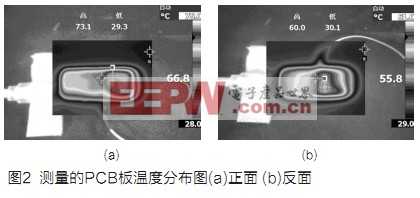 熱源器件的功耗分析、熱源器件的熱距離布局面積計算以及熱源器件的環(huán)境溫度分析都完成后就可以開始PCB的布局了,PCB的布局需要遵循最基本的熱設計原則,如:熱點分散;將最高功耗和發(fā)熱最大的器件布置在散熱最佳位置;不要將發(fā)熱較高的器件放置在印制板的角落和四周邊緣;高熱耗散器件在與基板連接時應盡能減少它們之間的熱阻等,另外還要按照上面計算的壓縮熱間距布放熱源器件,在熱源器件的壓縮熱間距內盡量少布器件,更不能布放發(fā)熱器件,熱源器件的背面也要盡量少布器件,更不能布放發(fā)熱器件。圖1為本項目的最終PCB版圖,圖2為其溫度測量圖。由圖可見,本設計方法是實用的。