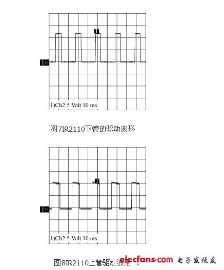 調試過程遇到的一個較為重要的問題是關于IR2110的自舉電容的選擇。IR2110的上管驅動是采用外部自舉電容上電,這就使得驅動電源的路數(shù)大大減少,但同時也對VB和VC之間的自舉電容的選擇也有一定的要求。經(jīng)過試驗后,最終采用1μF的電解電容,可以有效地滿足自舉電壓的要求。