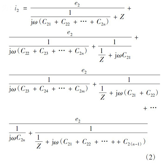在僅二次繞組有感應(yīng)電動(dòng)勢(shì)、一次繞組電動(dòng)勢(shì)為零的情況如圖6 所示。圖6 中:e2為每匝二次繞組的感應(yīng)電動(dòng)勢(shì);C2x為一匝二次繞組與一次繞組最外層間的寄生電容。