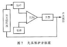 當(dāng)未穩(wěn)壓輸入的電壓值正常時(shí),穩(wěn)壓管ZD擊穿,晶體管V導(dǎo)通,繼電器動(dòng)作,觸點(diǎn)吸合,開關(guān)穩(wěn)壓器加電。當(dāng)輸入低于所允許的最低電壓值時(shí),穩(wěn)壓管ZD不通,V截止,觸點(diǎn)跳開,開關(guān)穩(wěn)壓器不能工作。開關(guān)穩(wěn)壓器內(nèi)部,由于控制電路失?;蛘唛_關(guān)三極管失效會(huì)使輸出電壓下降;負(fù)載發(fā)生短路也會(huì)使輸出電壓下降。特別在升壓型或反相升壓型的直流開關(guān)穩(wěn)壓器中欠電壓的保護(hù)是跟過電流保護(hù)緊密相關(guān)的,因而更加重要。實(shí)現(xiàn)方法是在開關(guān)穩(wěn)壓器的輸出端接電壓比較器,如圖7所示。