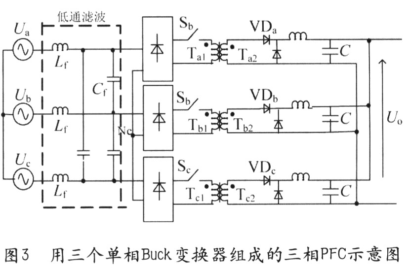 圖3用三個(gè)單相Buck變換器組成的三相PFC示意圖,圖3所示Buck型電路的結(jié)構(gòu)比較簡(jiǎn)單,同全橋電路相似,由于隔離變壓器反射電壓的影響,其相對(duì)于反激電路來(lái)說也有較大的電流失真,但其諧波仍可以限定在比較低水平,達(dá)到IEC—1000的要求。另外,其可實(shí)現(xiàn)的功率等級(jí)的大小不如全橋高,但比反激式電路要大。