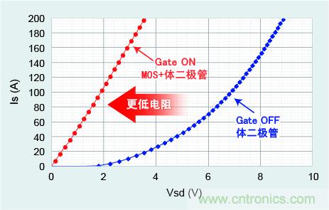 一般Si-IGBT元件無法逆向?qū)?,而SiC-MOSFET可通過體二極管實現(xiàn)常時逆向?qū)?。另外,通過輸入柵極信號,還可實現(xiàn)MOSFET的逆向?qū)?,與二極管相比,可實現(xiàn)更低電阻。通過這些逆向?qū)ㄌ匦?,與二極管整流方式相比,可在1000V以上的范圍采用高效同步整流方式的技術(shù)。