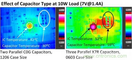 在使用C0G(較大封裝,低串聯(lián)等效電阻(ESR))和X7R(較小封裝,較高ESR)時(shí)的熱性能差異是十分可觀的(圖5)。