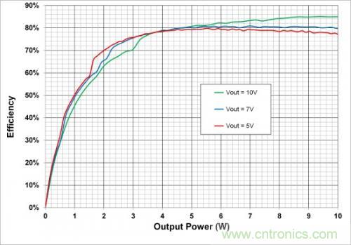 圖6.在5V,7V和10V輸出設(shè)置時(shí),10W電源系統(tǒng)的端到端效率