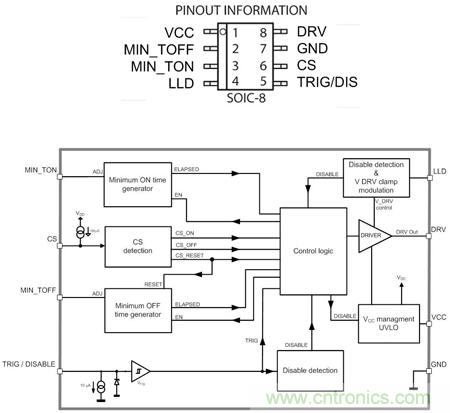 NCP4305可采用SOIC-8、DFN8和WDFN8三種封裝。MIN_TOFF 和MIN_TON引腳通過(guò)連接電阻到地,調(diào)節(jié)最小關(guān)斷和最小導(dǎo)通時(shí)間。LLD引腳用于在輕載時(shí)調(diào)節(jié)驅(qū)動(dòng)器鉗位電平,或關(guān)斷驅(qū)動(dòng)器。DRV引腳是同步整流MOSFET的驅(qū)動(dòng)器輸出。CS(電流采樣檢測(cè))引腳用于檢測(cè)電流是否流過(guò)同步整流MOSFET。TRIG/DIS引腳提供超快關(guān)斷輸入,用作在CCM應(yīng)用中關(guān)斷同步整流MOSFET以提升能效,當(dāng)上拉超過(guò)100 us時(shí)激活禁用模式。