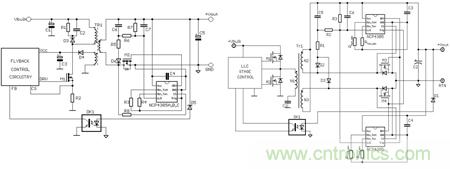 圖2. NCP4305 Flyback或QR應(yīng)用原理圖(左)和LLC應(yīng)用原理圖(右)