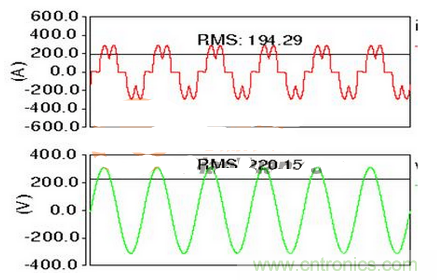 由上文中的公式,我們可以得出以下一個結(jié)論,那就是在6脈沖整流器的電流中,含6K(k為正整數(shù))次諧波,即5、7、11、13...等各次諧波,各次諧波的有效值與諧波次數(shù)成反比,且與基波有效值的比值為諧波次數(shù)的倒數(shù)。
