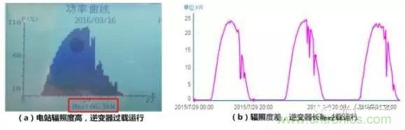 如正面案例所述,當輻照度或溫度等環(huán)境條件變化時,組件輸出功率會超過規(guī)格書中標定的最大功率,即“組件超發(fā)”,此種情況通常發(fā)生在部分光照資源較好的部分Ⅰ類資源區(qū),這就要求逆變器需具備將組件能量全部轉(zhuǎn)化的能力,即對逆變器“吐”的能力要求較高。否則將會出現(xiàn)棄光的現(xiàn)象,降低發(fā)電量,影響用戶收益,如圖2(a)所示。