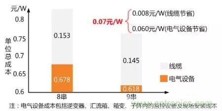 上述分析僅僅是考慮了光照資源,但在實際光伏系統(tǒng)中,由于灰塵遮擋,組件輸出至少降低2-3%,再考慮到組件衰減、電纜損耗等因素,實際傳輸?shù)侥孀兤鬏斎攵说闹绷鞴β视謺p少5-10%左右。此外,根據(jù)1.6MW典型系統(tǒng)設計方案成本計算表明,50kW組串式逆變器直流側(cè)接9串方案比8串方案,逆變器數(shù)量減少了12%以上,可節(jié)省系統(tǒng)初投資0.07元/W,100MW可節(jié)約初始投資700萬,這便是逆變器較高的“吞”能力帶來的好處,如圖3所示。