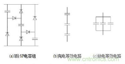 對于輸入輸出電壓相差很懸殊的情形,DC-DC變換器一般需要采用脈沖隔離變壓器來滿足電壓變比的要求。還可以采用如圖3所示的串并電容組合結(jié)構(gòu)(SP)[7,8]構(gòu)成工作儲能電容器,它具有串聯(lián)充電和并聯(lián)放電的特性,因此在失去交流電源而由工作儲能電容器放電維持工作期間,串并電容組合結(jié)構(gòu)實際上起到了降壓的作用。通過選取恰當(dāng)階數(shù)的串并電容組合結(jié)構(gòu),就有可能在DC-DC變換器中不需要采用隔離變壓器也能滿足電壓變比的要求。