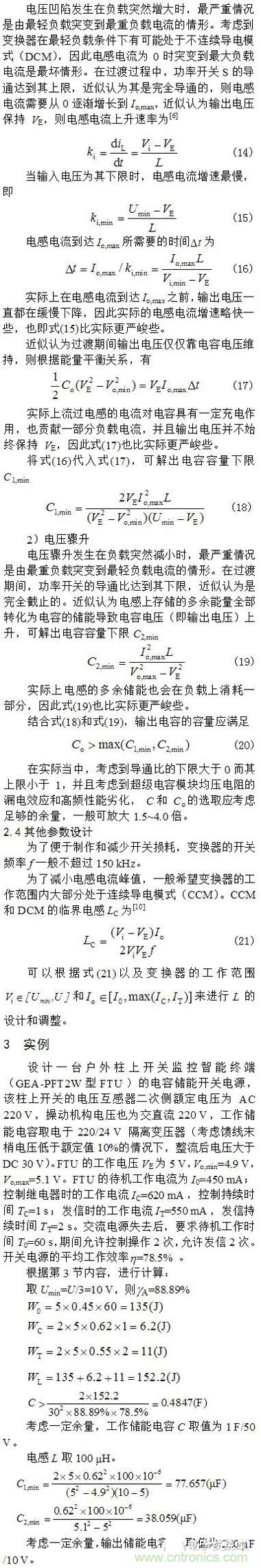 根據(jù)能量平衡關(guān)系,分析了負載突然增大和負載突然減輕情況下的最嚴重電壓凹陷和電壓驟升,并得出輸出濾波電容容量的設(shè)計考慮。以一個具體的電容儲能FTU電源為例,詳細說明了電路參數(shù)的設(shè)計方法,并進行了實驗研究。實驗結(jié)果表明所設(shè)計的電容儲能備用電源能夠滿足在失去正常供電電源后自動化終端待機、操作和通信的需要,并且所進行的理論分析與實際情況相符。