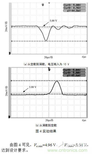 采用電阻器作為負載,并用開關(guān)分別接入和斷開進行了從空載到滿載和從滿載到空載的實驗,輸出電壓的波形如圖4所示。