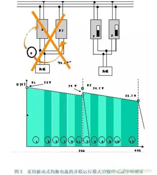 被動式均衡電流的并聯(lián)運行模式特點是:當輸出電流增大時,其輸出電壓會微量的減少,其輸出電壓是所謂的軟特性:輸出電壓隨著輸出電流的增加而稍微下降。其電源在空載到滿負載之間的輸出電壓的波動大約為4%~5%額定電壓即1V左右。這樣當二個電源并聯(lián)時,由于不同的電流負載產(chǎn)生了不同的輸出電壓,一個是有稍高輸出的電壓的電源首先承受負載電流,隨著電流量的增加,這個電源輸出電壓略降,低于另一個電源的輸出電壓,這樣另一電源承受負載電流,通過這樣階梯式交替的方法達到均衡電流的作用。均衡電流的平衡程度如何,取決于所有并聯(lián)電源的輸出電壓的初始調(diào)節(jié)和設置值。必需指出,這個方法的實現(xiàn)其輸出電源必須采用一個共同的接線端。