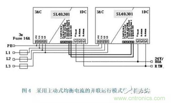 主動式均衡電流的并聯(lián)模式必須采用一根附加的均流線,這根均流線作為反饋信號傳送到電源的控制器來調(diào)節(jié)每個電源在所有的條件下提供相同的輸出電流,這時,電源電壓輸出的軟特征是不需要的,輸出電壓在任何場合下不受電流大小的影響,所以與被動式均衡電流相比,其輸出電壓精度高,同時與輸出電路的類型無關;但是對于開發(fā)和安裝來說,費用較高,因為在電源內(nèi)部需要一個精確度較高的電流測試線路和一個附加的電流調(diào)節(jié)器,同時也多一個接線端口。PULS電源的SL40.301三相24/40A的電源采用這種技術,所有的電源經(jīng)過均流線和地線相連接,如圖4所示。