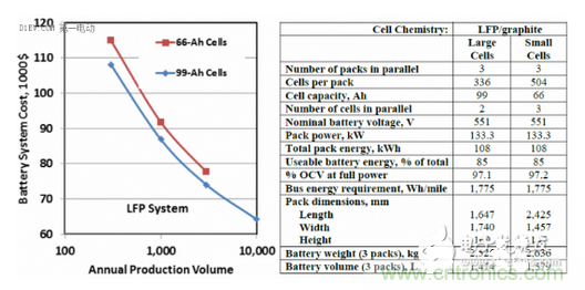 美國阿貢國家實(shí)驗(yàn)室研究了66Ah、99Ah磷酸亞鐵鋰LFP電池成本跟產(chǎn)量的關(guān)系(圖3),研究顯示兩種電池的成本隨著產(chǎn)量的增加下降趨勢基本一致,但是大容量的電池成本比小容量的電池成本更低一些。