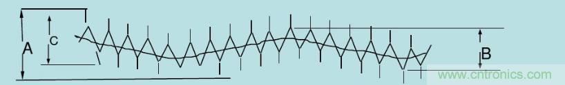 (1). 按測試回路接好各測試儀器,設(shè)備,以及待測品,測試電源在各種LINE 和LOAD,及溫度條件之RIPPLE &NOISE(下圖為一典型輸出RIPPLE & NOISE A: RIPPLE+NOISE; B: RIPPLE; C: NOISE。