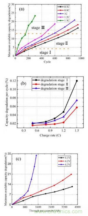 從數(shù)據(jù)可以看到,隨著充電的倍率的加大,鋰離子電池的衰降速率也在快速增加,并且從曲線的斜率來看,電池的衰降速度存在三個不同的階段,前期衰降速度較快的階段(階段1),中間衰降速度較慢的穩(wěn)定階段(階段2),和后期的衰降速率加速階段(階段3)。針對三個階段電池的衰降機理的研究認為,階段1可能是因為電池SEI膜生長需要消耗一部分Li+,因此衰降速度較快。在階段2隨著SEI膜結構的穩(wěn)定,內部較為穩(wěn)定,因此衰降速度較慢,在階段3隨著電池老化,開始發(fā)生活性物質損失,電極活性界面減少,導致電池對于電流十分敏感。圖C是針對不同的截止電壓對電池衰降速度影響的實驗,從實驗結果可以看到,當把充電截止電壓提高到4.3V時會導致電池的循環(huán)性能急劇惡化,降低充電截止電壓可以有效的改善電池的循環(huán)性能。