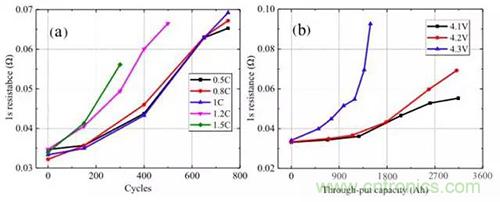 對電池的動態(tài)內阻分析如下圖所示,從圖a測試結果來看,當充電電流小于1C時,電池動態(tài)內阻隨著電池循環(huán)的變化趨勢幾乎時一樣的,但是當充電電流超過1C時,電池動態(tài)內阻增加速度會隨著充電速率的增加而快速增加。從圖b的測試結果來看,當充電截止電壓為4.3V時,電池動態(tài)內阻增加非常迅速表明高截止電壓會惡化電池的動力學條件,截止電壓為4.1V和4.2V時電池動態(tài)內阻增加較為緩慢。