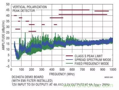 LT8650S 的設(shè)計兼具控制良好的開關(guān)邊沿和一種具整體接地平面的內(nèi)部結(jié)構(gòu),并用銅柱代替了接合線,因此顯著降低了 EMI / EMC 輻射。參見圖 2 以了解輻射輸出特性。這種改進的 EMI / EMC 性能對電路板布局不敏感,從而簡化了設(shè)計并降低了風險,甚至在使用兩層 PC 板時也不例外。LT8650S 在整個負載范圍內(nèi)以 2MHz 開關(guān)頻率切換時,能夠非常容易地滿足汽車 CISPR 25 Class 5 峰值 EMI 限制。擴展頻譜頻率調(diào)制也可用來進一步降低 EMI 水平。