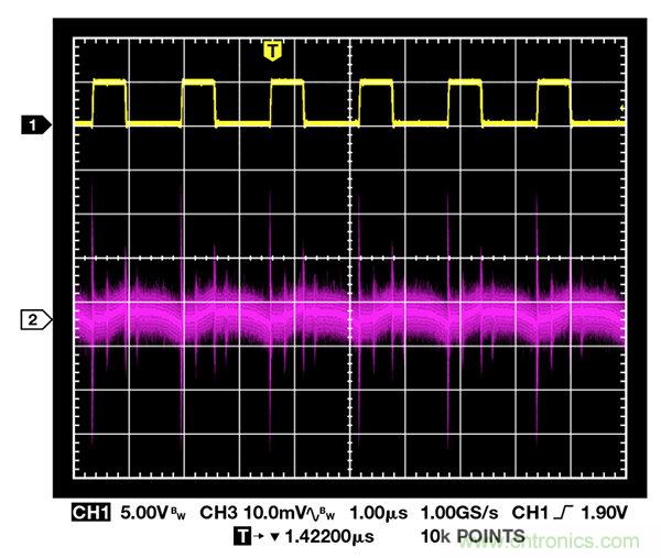 如圖7所示,使用接地線圈在輸出電容上直接探測可以產(chǎn)生近乎最佳的輸出紋波。開關(guān)瞬變的噪聲情況有所改善,且PCB上的走線電感大幅下降。但是,紋波上還是明顯疊加了低幅度信號輪廓,如圖8所示。