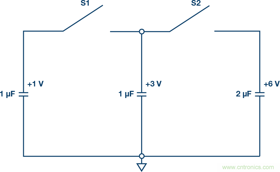 圖8.測驗(yàn):三個理想電容充電到所示電壓。先閉合S1,再閉合S2之后,該組電容的最終電壓是多少?如果開關(guān)閉合的先后順序相反,該組電容的最終電壓是多少?