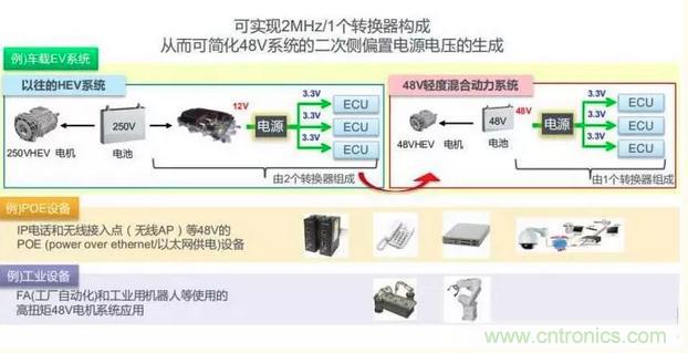 其中,一次電源主要是從48V或12V降到5V或3V,用于車載導(dǎo)航等。二次電源是從5V降到1.25到1V,用于ADAS(高級(jí)駕駛員輔助系統(tǒng))等,未來的技術(shù)趨勢(shì)是更小封裝,開發(fā)高附加價(jià)值的電源IC。