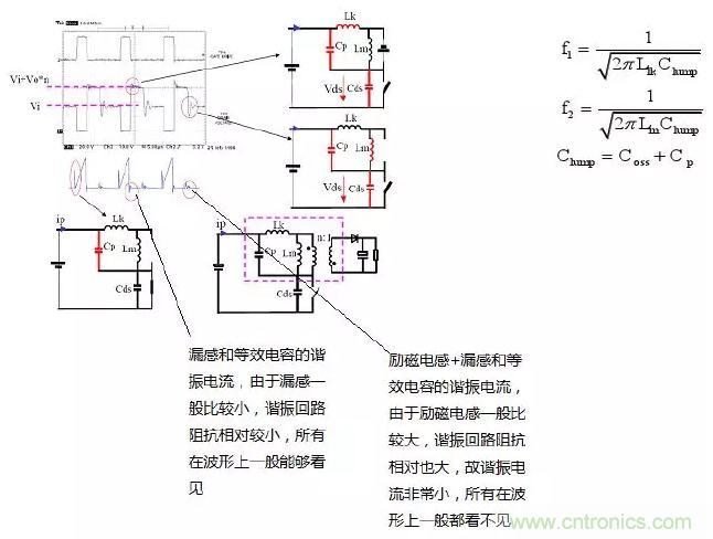 f1比f2大很多(從波形上可以看出),這是由于漏感一般相對較小;同時由于f1所在回路阻抗比較小,諧振電流較大,所以能夠很快消耗在等效電阻上,這也就是為什么f1所在回路很快就諧振結(jié)束的原因?。ň唧w諧振時間可以通過等效模型求解:二次微分方程估算)