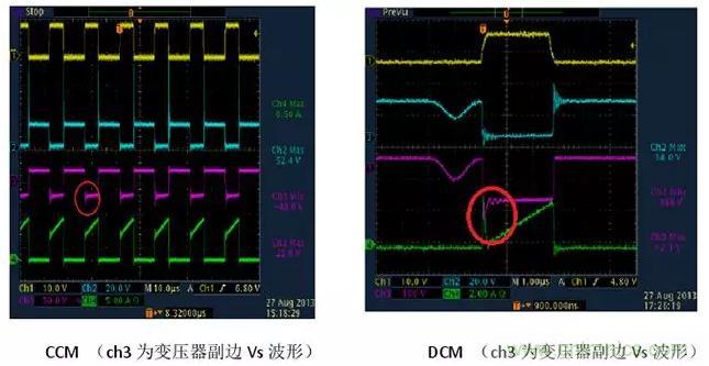 因此我們就可以很容易從波形上看出來反激電源是工作在CCM還是DCM狀態(tài)。