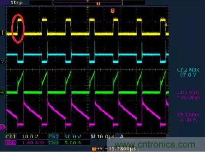 不管是在CCM模式還是DCM模式,在mosfet開通on時刻,變壓器副邊都有震蕩。主要原因是初次及之間的漏感+輸出肖特基(或快恢復)結(jié)電容+輸出電容諧振引起,在CCM模式下與肖特基的反向恢復電流也一些關系。故一般在輸出肖特基上并聯(lián)-一個RC來吸收,使肖特基應力減小。