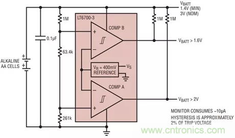 有些器件其將400mV基準(zhǔn)電壓源與比較器相結(jié)合,是集成度更高的解決方案,可用作電壓監(jiān)控器或窗口比較器。400mV基準(zhǔn)電壓源可以監(jiān)控小輸入信號(hào),從而降低監(jiān)控電路的復(fù)雜性(圖3);它還能監(jiān)控采用非常低電源電壓工作的電路元件。如果閾值較大,可以添加一個(gè)簡(jiǎn)單的電阻分壓器(圖4)。這些產(chǎn)品均采用小尺寸封裝(SOT23),功耗很低(低于10μA),支持寬電源范圍(1.4V至18V)。