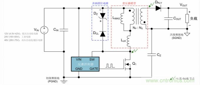 圖 1:采用典型的 24V 電源或 12V/48V 輸入(分別用于工業(yè)或汽車電池應(yīng)用)的 DC-DC 反激式穩(wěn)壓器。圖中已明確標(biāo)出具有磁化作用的反激式變壓器、漏電感以及電路寄生電容
