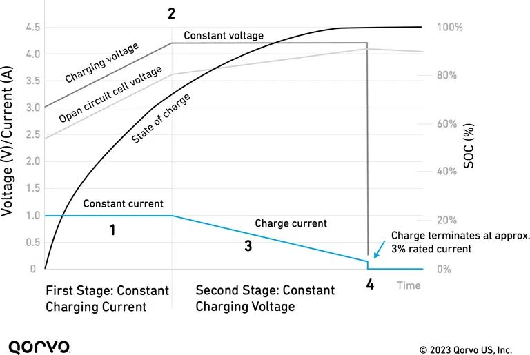 4. 對于傳統(tǒng)含鈷鋰電池,當(dāng)電流降至電池 Ah 額定值的 3%-5% 時,便表示鋰離子電池已充滿電。達(dá)到該閾值后,充電過程會終止,以避免電池發(fā)生性能退化。