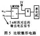 圖 5示出比較整形電路。首先在靜態(tài)下測(cè)量距離等于5 m,檢波器的輸出電壓值(該電壓同樣是經(jīng)過(guò)放大檢波電路得到的),并以此電壓值作為比較器的參考電壓uR。比較器選用LM339,具有失調(diào)電壓小,電源電壓范圍寬,其單電源電壓為2~36 V,雙電源電壓為±1~±18 V,而且對(duì)比較信號(hào)源的內(nèi)阻限制較寬等優(yōu)點(diǎn)。對(duì)于LM339來(lái)說(shuō),當(dāng)兩個(gè)輸入端電壓差大于10 mV時(shí),就能確保其輸出從一種狀態(tài)可靠地轉(zhuǎn)換到另一種狀態(tài)。因此,把LM339用在弱信號(hào)檢測(cè)等場(chǎng)合是比較理想的。一般情況下,比較電路的輸出波形的上升沿和下降沿都有延時(shí),可在其后面加一個(gè)與門(mén),以改善輸出特性。將比較整形電骼的輸出送到單片機(jī),對(duì)脈沖計(jì)數(shù),得到渡越時(shí)間。單片機(jī)選AT89C52。