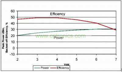 驅(qū)動級對總體功耗也有貢獻。包括驅(qū)動級在內(nèi)的功率添加效率(PAE)在7.8dB后退點處大于33%,此后退效率可以在廣泛的電源中實現(xiàn)。圖5顯示了各種電源電壓下放大器后退7.8dB時的效率,注意,確實有兩種方式控制放大器的瞬時輸出功率,即異相和改變電源電壓。電源電壓通常用于緩慢改變平均輸出功率,相位角用于快速改變信號的瞬時包絡(luò)線。