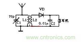 本收音機(jī)電路如圖 1 所示,主要由調(diào)諧電路和檢波電路組成,其中 L1 、 C1 及天線組成調(diào)諧電路;二極管 VD 起檢波作用, C2 起濾波作用,通過(guò)耳機(jī)放音。