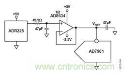 本參考設(shè)計(jì)的+5V和?2.5V供電軌需要外部低噪聲電源。AD7981是低功耗器件,可由基準(zhǔn)電壓緩沖器直接供電,如圖5所示,因而無需額外的供電軌,節(jié)省功耗和板空間。