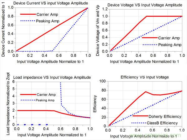 當(dāng)歸一化輸入電壓為(0~0.5)時,輸出匹配電路呈獻給載波放大器的阻抗是所對應(yīng)的傳統(tǒng)AB類放大器阻抗的兩倍,如圖4左下子圖所示。由于輸出匹配電路阻抗提高到傳統(tǒng)AB類放大器的兩倍,所以當(dāng)歸一化輸入電壓達到0.5時,載波放大器將達到傳統(tǒng)放大器臨界飽和點,因此效率也將達到臨界飽和點的效率,比如B類放大器的臨界飽和效率為Pi/4。在這個輸入電壓范圍內(nèi)載波放大器和基于同樣器件設(shè)計的傳統(tǒng)AB類放大器相比,因為載波放大器輸出匹配電路所呈現(xiàn)的阻抗是傳統(tǒng)AB類放大器的兩倍,所以理論上載波放大器的增益將要高出AB類放大器3dB,輸出1dB壓縮點降低3dB。