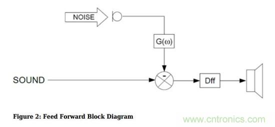 如果把系統(tǒng)畫成信號(hào)流圖,就是下圖,噪聲在麥克風(fēng)采樣后進(jìn)入信號(hào)處理電路,產(chǎn)生“反”噪聲,并與音樂一起送進(jìn)耳機(jī)內(nèi)。這種模式稱為前饋有源噪聲消除。
