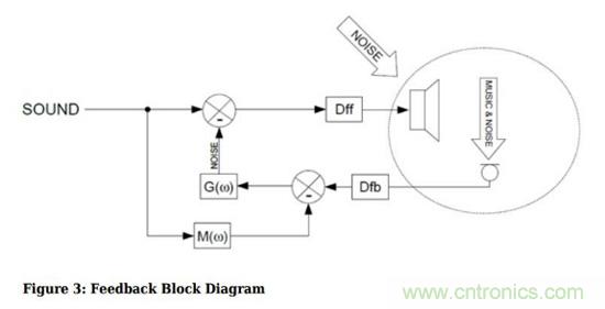 在反饋有源噪聲消除方案中,麥克風(fēng)采樣的不是直接的環(huán)境噪聲,而是耳機(jī)輸出處的聲音,顯然這里的聲音包括了音樂和環(huán)境噪聲。那么如何選擇性地抵消掉噪聲但是保留音樂呢?就需要把這里采樣到的聲音減去音樂,這樣剩下的信號(hào)就全是噪聲了;然后再根據(jù)這個(gè)噪聲去產(chǎn)生噪聲抵消信號(hào)。這樣做的話,就不會(huì)有風(fēng)噪問題。然而,這里又有一個(gè)新問題,就是反饋系統(tǒng)通常帶寬會(huì)遠(yuǎn)小于前饋系統(tǒng),因此使用反饋模式的有源噪聲消除對(duì)于高頻噪聲的抵消作用有限。