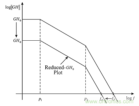 為分離極點(diǎn)和零點(diǎn),必須通過使R2 < < R1來分開時(shí)間常數(shù)。然而,這也使得分頻器準(zhǔn)靜態(tài)增益 < < 1。是利是弊,取決于回路。對(duì)于由準(zhǔn)靜態(tài)回路增益太大導(dǎo)致振蕩(或循環(huán)過度)的回路,GH0不僅會(huì)產(chǎn)生零點(diǎn)增加相位,而且由分頻器引起的GH0的減小會(huì)使波特幅度曲線向下。因幅度隨頻率下降,fT經(jīng)由移動(dòng)到圖2中左側(cè)(如圖2所示)而降低——下降到相位延遲不那么大且回路更穩(wěn)定的位置。